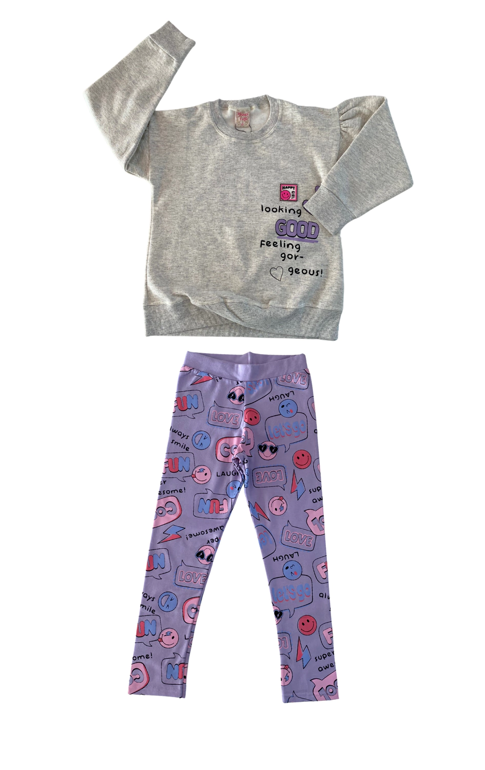 O Conj. Brincar é arte, Blusão vem com a estampa escrita na frente, atrás tem estampado de emoji e mais escritos com gliter, o conjunto acompanha uma calça molecotton inteira estampada, possui punhos e é acinturado. Um look lindissimo que vai fazer sua princesa arrasar.