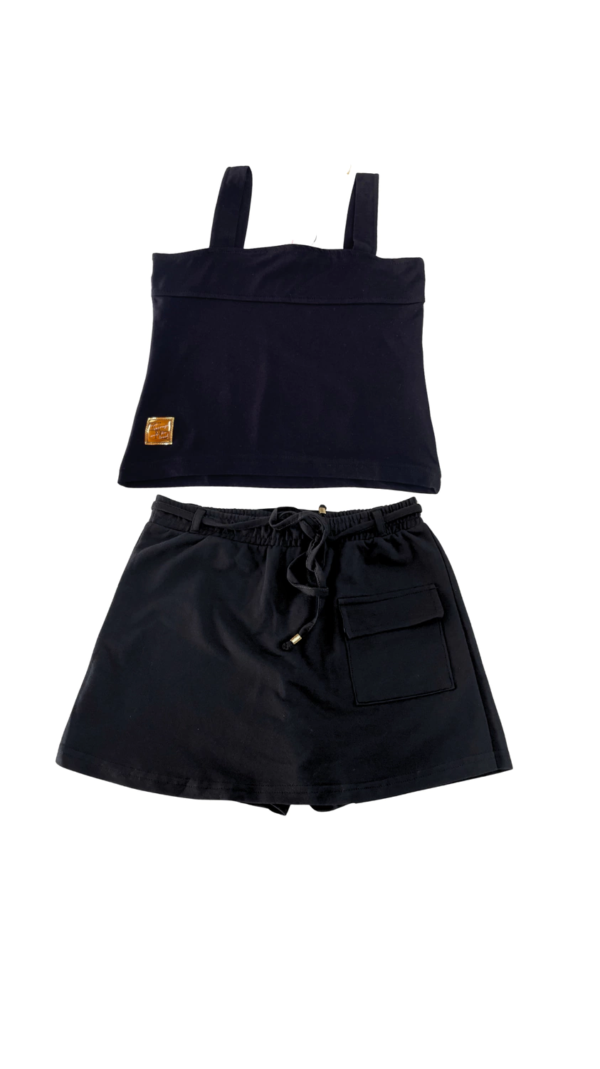 Lindo conjunto composto por regata com alça gradada, possui detalhes em costura e um corte reto, acompanha um short saia com laço para amarração e bolso lateral. Look lindissimo e super estiloso, sua princesa vai arrasar!