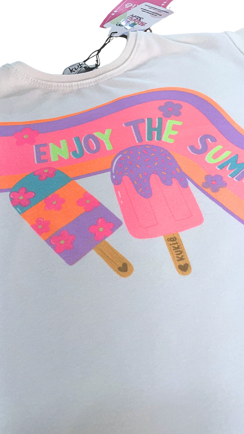 Conjunto Kukiê vem a camisa com estampa de escritos e picole, acompanha um short crepe span Perfeito para garantir muito conforto para as meninas, sem deixar o estilo de lado.