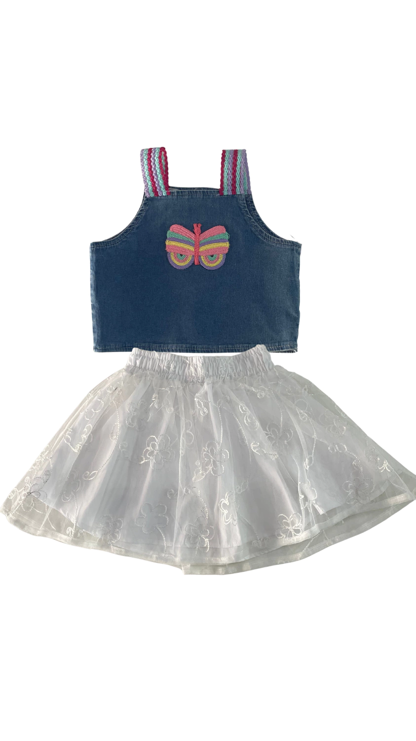 Conjunto Kukiê vem a blusa estilo regata jeans com estampa central de uma borboleta bordada e alças em elástico, acompanha um short saia com tule estampado em tecido lurex. Perfeito para garantir muito conforto para as meninas, sem deixar o estilo de lado.