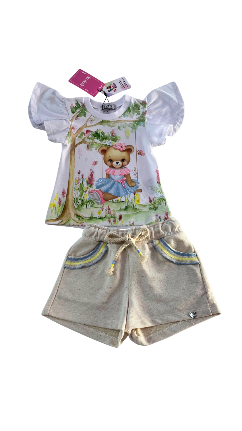 Superestiloso, o conjunto Kukiê possui uma blusa com estampa de ursinho em um balanço com detalhes em strass, acompanha um short em tecido moletinho, possui elástico na cintura, bolsos e laço para amarração. O look perfeito para sua princesa arrasar como sempre.