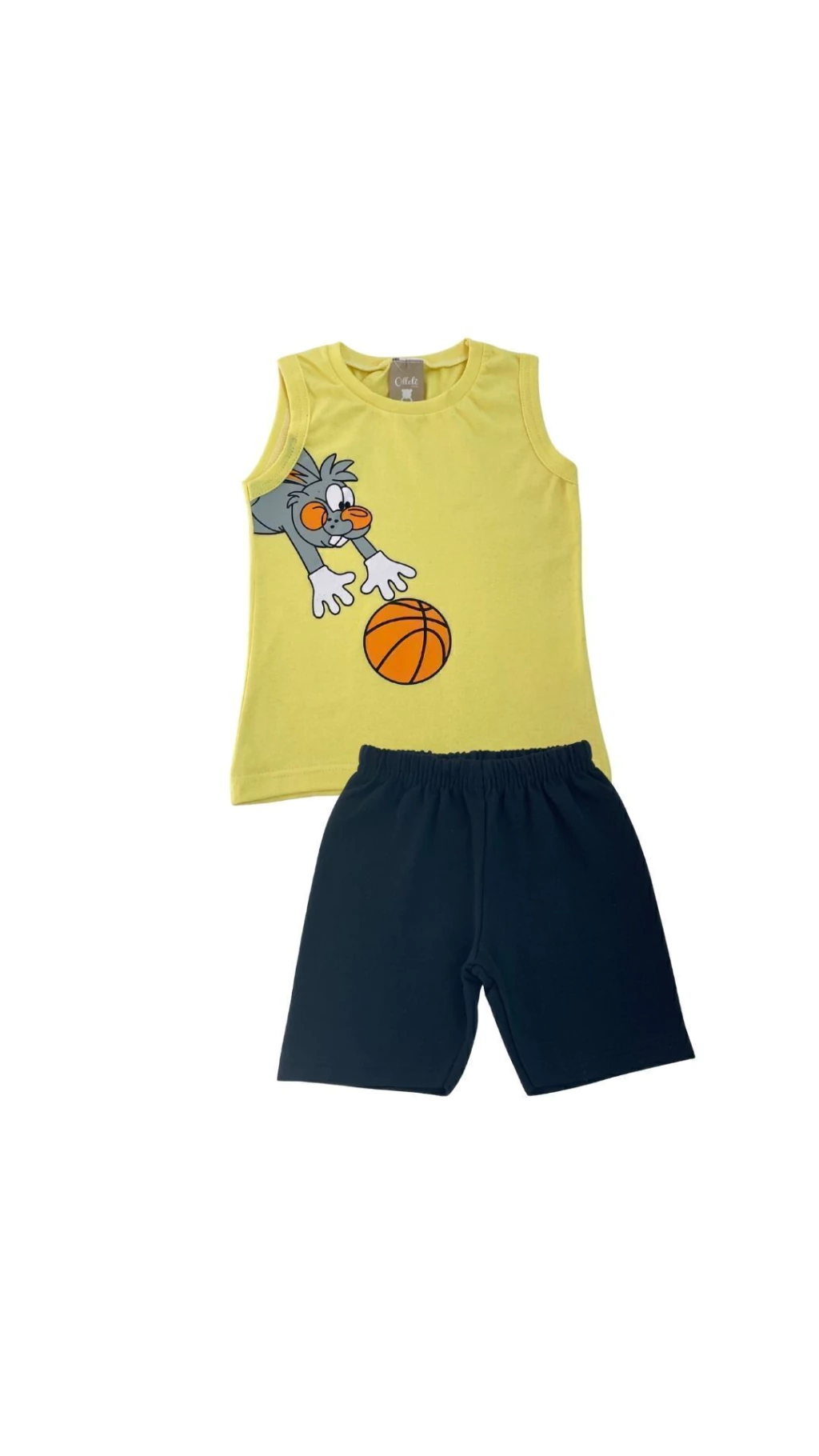 O conjunto masculino Ollelê. regata esuper fofa com estampa de coelho e uma bola de basquete, acompanha um short em moletinho com elástico na cintura, proporcionando conforto e liberdade para brincar à vontade! Perfeito para os dias de calor, é a escolha certa para um passeio cheio de estilo e diversão.
