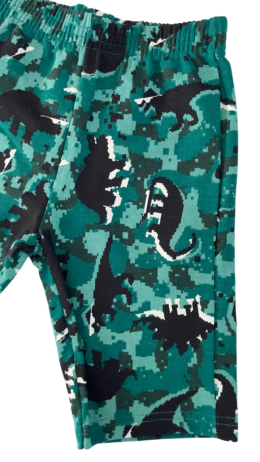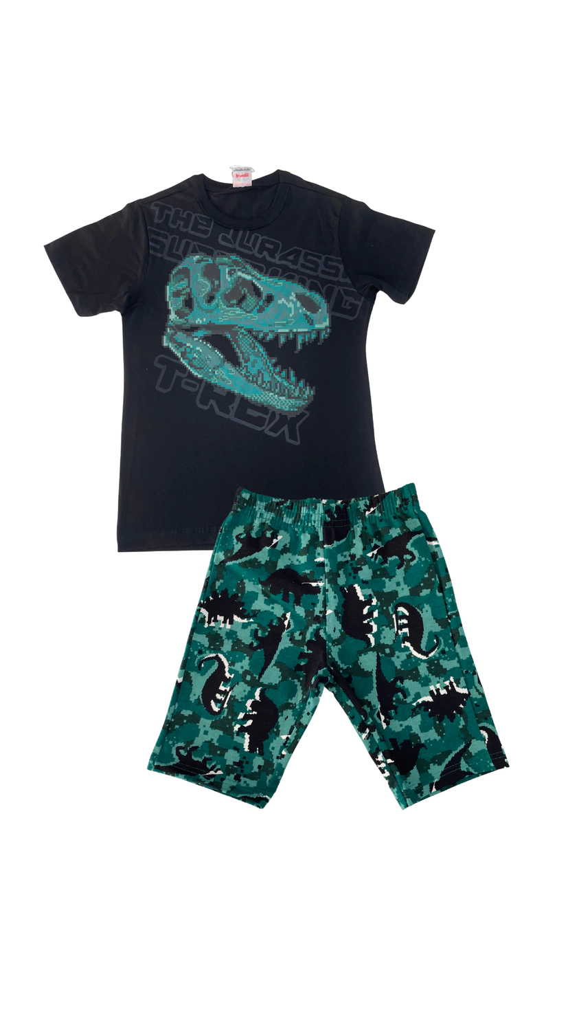 Esse look é perfeito para o verão. O conjunto é composto por uma blusa com estampa do cranio de um t-rex em pixel texturizado, acompanha um short moletinho todo estampado, possui elástico deixando o caimento perfeito. Quando você pensa no look ideal para deixar seu Príncipe Lindo, com certeza é esse que vem na mente né?!